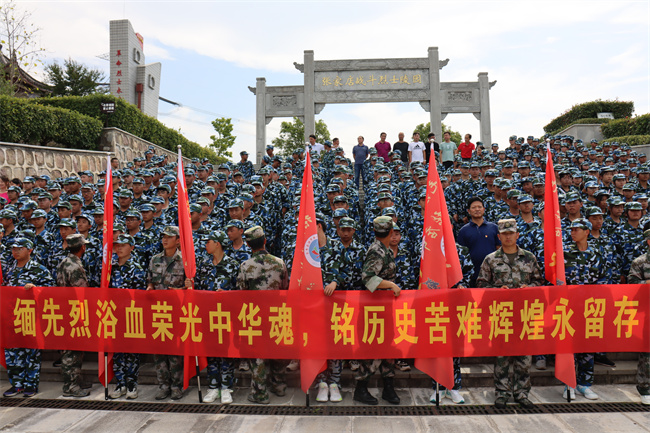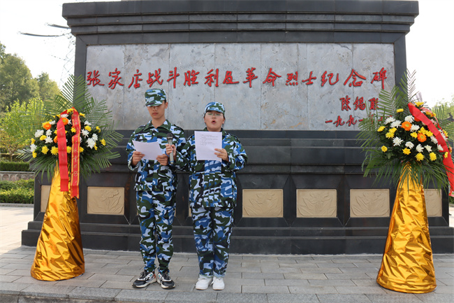 同学们在教官的指挥下,唱起嘹亮军歌,时而急行,时而缓步,浩浩荡荡向前进发。每个连队的护旗手高擎红旗,走在各自队伍的前面,各连教官和班主任在队伍旁指挥,不时提醒学生们注意安全。校医则携带药品跟随着拉练队伍后面,做到及时处理途中出现的伤病情况。同学们,步伐整齐,秩序井然,旗手们高举各班军训旗帜,边行进边唱军歌、喊口号,行进过程中嘹亮高亢的军歌声从未间断。军训团成员飒爽的英姿,整肃的军容,良好的精神状态吸引了沿途民众,他们纷纷驻足观看,有的民众还拿出手机,拍摄下这一壮观的景象。队伍中迎风招展的旗帜也成为了一道亮丽的风景线。经过近一个小时的跋涉,同学们顺利到达张家店战役烈士陵园。在那里举行了隆重的纪念仪式,副校长毛用三向同学们讲述了张家店战役的经过,同学们握紧了右拳进行了集中宣誓:“历史将革命的接力棒传给了我们,今天,我们以革命事业接班人的名义承诺。”铿锵有力的宣誓声响彻云霄。同学们最后瞻仰了张家店战役纪念碑。回来的路上,同学们还参观了张店镇中心幼儿园。