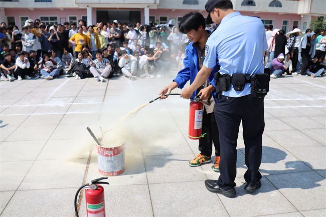 接着,张店镇派出所的警官为同学们进行了消防安全知识宣传,警官向同学们讲述了火灾发生后的严重后果及发生火灾后的安全疏散与逃生知识,以实际生活中的许多真实案例,讲解了如何安全用电、用气及发生火情时的紧急措施和自救、逃生的方法。随后,警官向同学们讲解了灭火器的使用方法,并进行了现场示范操作,同学们也进行模拟训练。