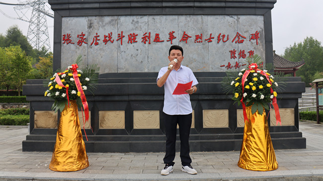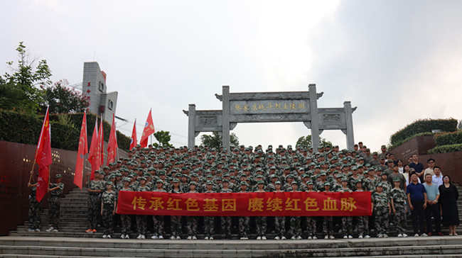 同学们在教官的指挥下,唱起嘹亮军歌,时而急行,时而缓步,浩浩荡荡向前进发。每个连队的护旗手高擎红旗,走在各自队伍的前面,各连教官和班主任在队伍旁指挥,不时提醒同学们们注意安全。校医则携带药品跟随着拉练队伍后面,做到及时处理途中出现的伤病情况。同学们步伐整齐,秩序井然,旗手们高举各班军训旗帜,边行进边唱军歌、喊口号,行进过程中嘹亮高亢的军歌声从未间断。军训团成员飒爽的英姿,整肃的军容,良好的精神状态吸引了沿途民众,他们纷纷驻足观看,有的民众还拿出手机,拍摄下这一壮观的景象。队伍中迎风招展的旗帜也成为了一道亮丽的风景线。经过近一个小时的跋涉,同学们顺利到达张家店战役烈士陵园。在那里举行了隆重的纪念仪式,仪式由校团委书记杨孝荣主持。学生代表向革命烈士们进献了花篮,校党支部书记、校长左益斌、副校长肖光明整理了花篮绶带。政教处主任邬宗江向同学们讲述了张家店战役的经过,新生代表在烈士墓前朗诵诗歌《站在烈士墓前》,并带领同学们宣誓,同学们握紧了右拳进行了集中宣誓:“历史将革命的接力棒传给了我们,今天,我们以革命事业接班人的名义承诺。”铿锵有力的宣誓声响彻云霄。新生代表还在烈士墓前进行了献诗活动。最后,左益斌校长作了总结讲话,他说:青山埋忠骨,史册载功勋。革命先烈,浩气长存,永垂不朽!同学们,你们风华正茂,是时代的幸运儿,应珍惜来之不易的幸福生活,健康成长,奋斗成才。让我们继承先烈的遗志,为家乡的建设,为祖国的繁荣昌盛而努力学习,共创美好的明天。同学们最后瞻仰了张家店战役纪念碑。