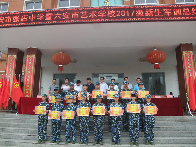 8月29日上午,张店中学暨六安市艺术学校2017级新生军训汇报表演暨总结表彰大会在该校红旗广场举行。张店中学行政领导、军之旅承训单位领导李千勇、军训各班主任及承训的官兵参加。