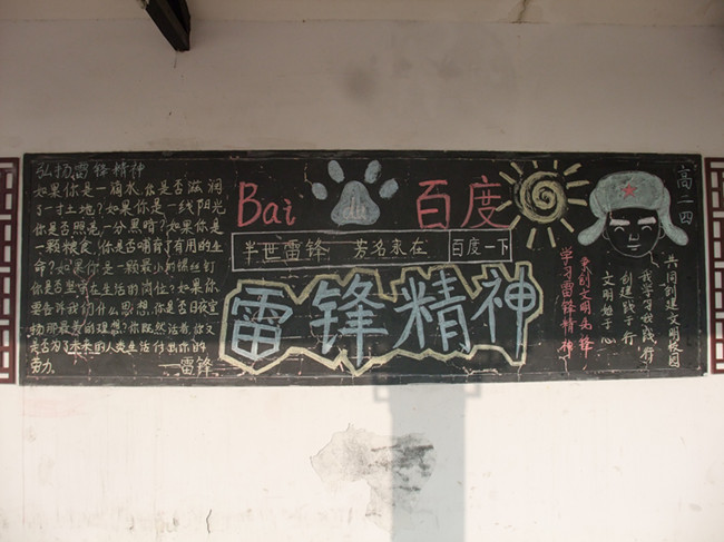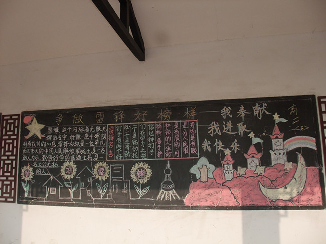 活动中,各个班级积极参与,同学们充分利用课外空闲时间,小组合作,明确分工,认真搜集素材,精心设计版面,并根据自己的理解,用优美的文字、精湛的画艺、合理巧妙的编排设计诠释着“雷锋精神”的内涵,把对雷锋的崇敬和怀念之情深深融入到板报的创作之中,用板报追述了雷锋同志的光辉事迹,赞扬了他的“钉子”精神,歌颂了他全心全意为人民服务的品质。