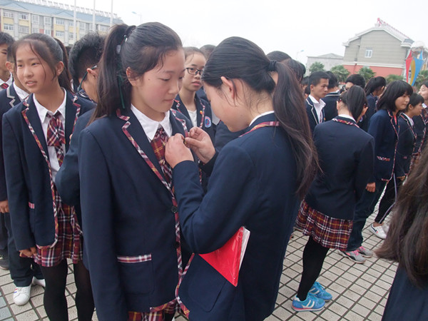 9点40分,举行了新团员入团宣誓,宣誓完毕,受表彰的优秀团员为新入团团员佩戴了团徽。