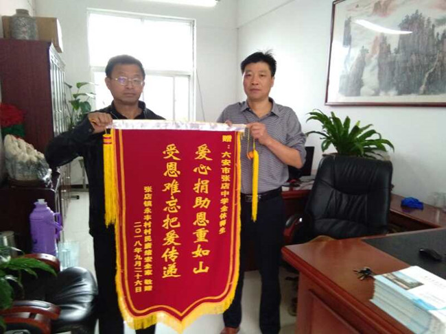 9月28日上午,张店中学高二学生唐韵的父亲给该校师生送来一面锦旗,上面写到:爱心捐助恩爱如山,受恩难忘把爱传递。唐韵家长为什么要给学校送来锦旗呢?