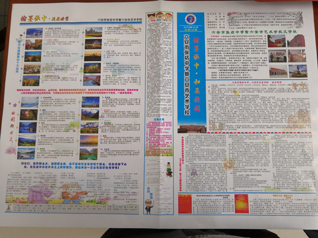 新版校园报相对于旧版有着较大的改观,除版面增加一倍以外,页面全部采用彩印,文字与图画搭配相得益彰,美观大方,给人以赏心悦目的感觉。报纸内容以“翰墨张中,和美校园”为主题,分为“新闻瞭望”、“漫游世界”、“文海拾贝”、“益海采英”四个板块,第一板块的校长寄语体现出陈校长对同学们的谆谆教诲和殷切期望,每个版块同学们用文字、绘画等叙写张店中学师生活动的点点滴滴,展现张中的精神风貌,每一件作品都是同学们的真情流出,显示出张中学子的理想远大、昂扬奋进、永不言弃的美好品格。新校园报出版以后,同学们爱不释手,都期待着下期早些出版。(邓启胜)