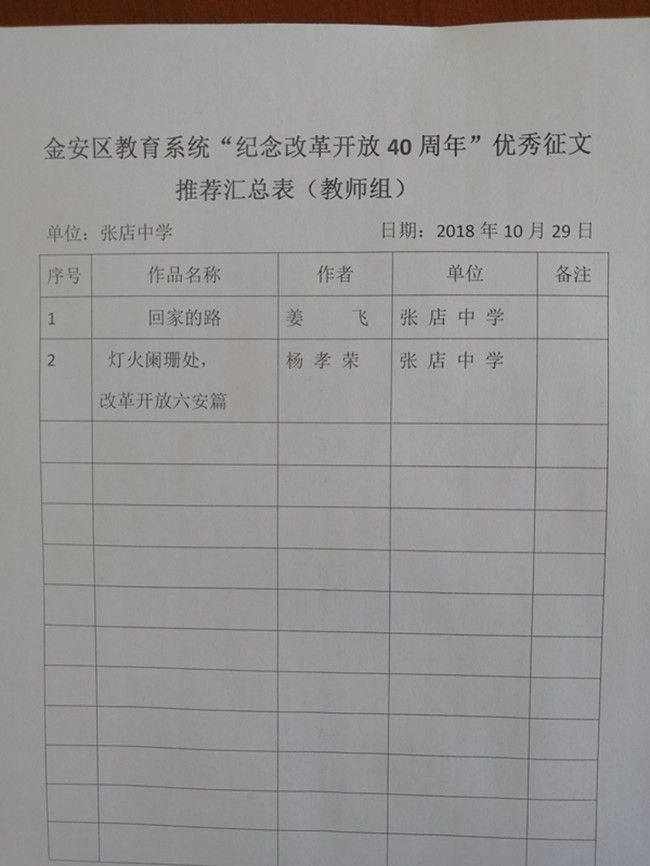 校教育工会本着公平、公正、公开的原则,组织评审团进行了认真的筛选,最后教师组的姜飞老师《回家的路》,杨孝荣老师的《灯火阑珊处,改革开放六安篇》入选教师组优秀征文;高一(6)班的郭旭同学的《风风雨雨四十载 ,改革春风吹进来》等5位同学的作品入选学生优秀征文,这些征文将上报区教育局参加优秀征文的评选。(邓启胜)
