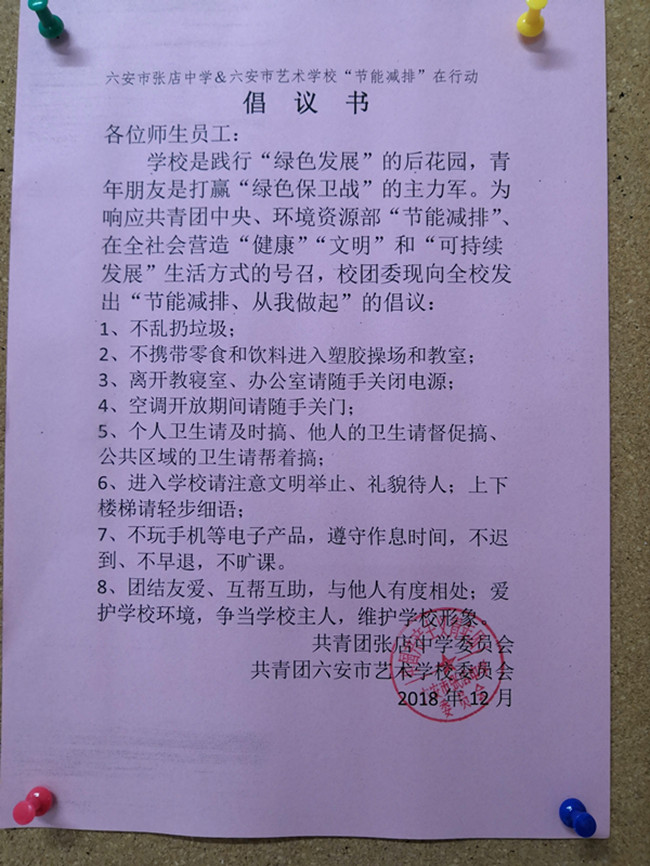 为响应共青团中央、环境资源部“节能减排”、在全社会营造“健康”“文明”和“可持续发展”生活方式的号召,12月7日,张店中学团委向全校发出“节能减排、从我做起”的倡议。 在学生干部会议上团委书记毛用三号召全体师生践行节约集约循环利用的资源观,大力倡导勤俭节约的社会风尚,营造节能降碳的深厚氛围,推进节约型校园建设。倡导同学们树立节能理念,养成离开教室或宿舍随手关灯、关空调、关风扇的良好习惯,争做节能环保的楷模。 在倡议书中倡导同学们要不乱扔垃圾、不携带零食和饮料进入塑胶操场和教室;个人卫生请及时搞、他人的卫生请督促搞、公共区域的卫生请帮着搞;进入学校请注意文明举止、礼貌待人;上下楼梯请轻步细语;不玩手机等电子产品,遵守作息时间;团结友爱、互帮互助,与他人有度相处;爱护学校环境,争当学校主人,维护学校形象。(邓启胜)