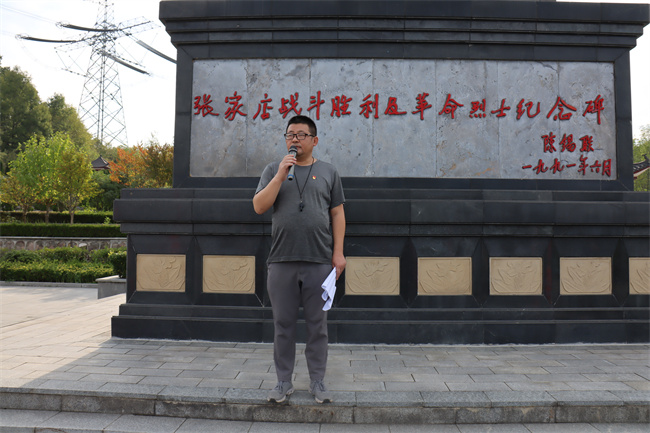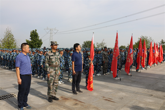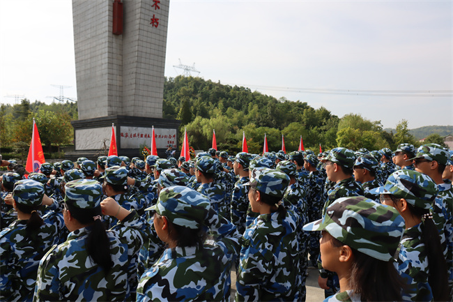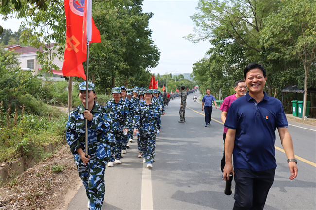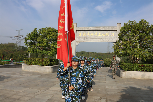 同学们在教官的指挥下,唱起嘹亮军歌,时而急行,时而缓步,浩浩荡荡向前进发。每个连队的护旗手高擎红旗,走在各自队伍的前面,各连教官和班主任在队伍旁指挥,不时提醒学生们注意安全。校医则携带药品跟随着拉练队伍后面,做到及时处理途中出现的伤病情况。同学们,步伐整齐,秩序井然,旗手们高举各班军训旗帜,边行进边唱军歌、喊口号,行进过程中嘹亮高亢的军歌声从未间断。军训团成员飒爽的英姿,整肃的军容,良好的精神状态吸引了沿途民众,他们纷纷驻足观看,有的民众还拿出手机,拍摄下这一壮观的景象。队伍中迎风招展的旗帜也成为了一道亮丽的风景线。经过近一个小时的跋涉,同学们顺利到达张家店战役烈士陵园。在那里举行了隆重的纪念仪式,副校长毛用三向同学们讲述了张家店战役的经过,同学们握紧了右拳进行了集中宣誓:“历史将革命的接力棒传给了我们,今天,我们以革命事业接班人的名义承诺。”铿锵有力的宣誓声响彻云霄。同学们最后瞻仰了张家店战役纪念碑。回来的路上,同学们还参观了张店镇中心幼儿园。