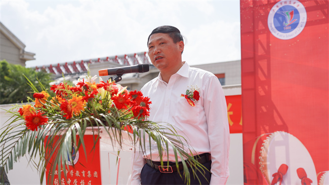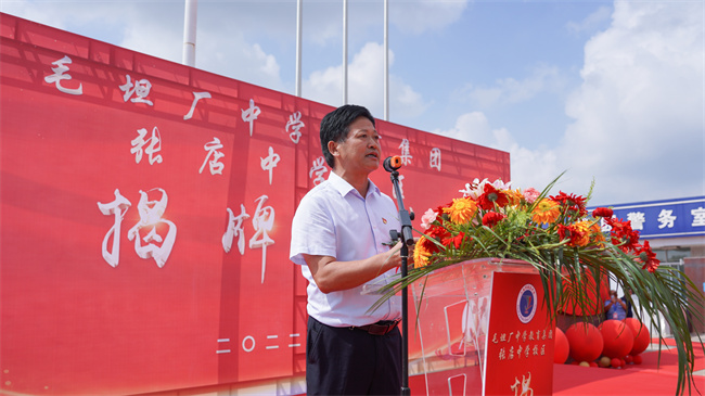 余存宝发表讲话,他说,值此第38个教师节、中秋节刚刚过去,党的二十大即将胜利召开之际,我们怀着喜悦的心情,我代表毛坦厂教育集团对张店中学校区揭牌仪式的顺利进行表示热烈的祝贺。近年来,随着社会经济和教育形势的发展,人民群众让孩子在家门口好上学、上好学、读好书的愿望日益迫切,为了解决金安区人民对优质教育资源的迫切需求和优质教育资源发展不平衡、不充分之间的矛盾,在区教育局、集团的统一部署下,2022年8月8日,毛毯厂中学教育集团正式成立,从此毛坦厂中学、张店中学等九所学校成为了不分你我的一家人。统一教研教改、统一教师队伍、统一考核评价,毛毯厂中学作为集团的牵头学校,将进一步的发挥领头雁的作用,办人民群众满意的学校。我们九所学校都能成为人民群众满意的好学校。张店中学是六安市示范高中,自1958年建校以来,在一代一代张中人的不懈努力下,办学条件日益改善,办学特色越来越鲜明、教学质量不断提高,教学成绩日益上升。此次揭牌仪式的成功举行,是教育融合发展、均衡发展的重要体现,必将为张店中学的教育事业注入一针强心剂。他希望,在集团办学文化的引领下,张店中学的教育能够实现齐头并进、共同发展。(邓启胜)