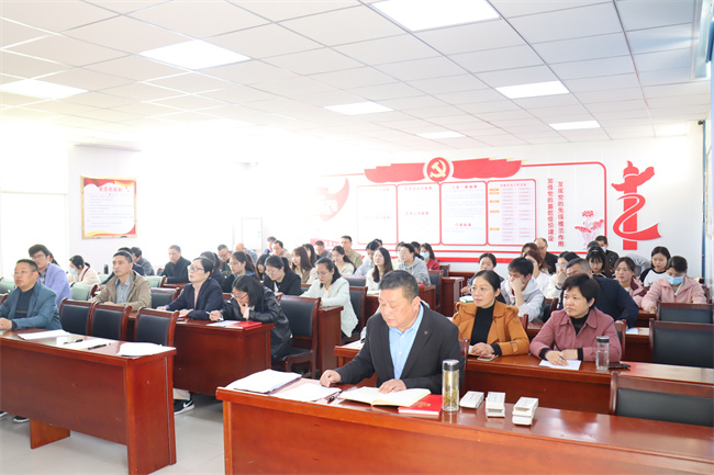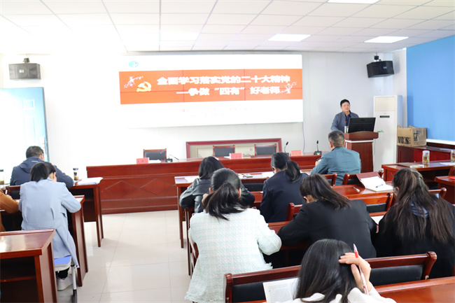 校长左益斌作了《全面学习落实党的二十大精神,争做“四有”好老师》的工作报告。左益斌指出,党的二十大报告提出全面建设社会主义现代化国家。教育兴,则国运兴,教育是强国之基,是育人之本。作为新时代的教师要全面贯彻党的教育方针,坚定不移落实立德树人根本任务,培养德智体美劳全面发展的社会主义建设者和接班人。作为教师,要以党的二十大精神为指引,脚踏实地工作,全心全意育人,把自身的热情与对学生的爱转化为干好工作的动力,继续向着做有理想信念、有道德情操、有扎实学识、有仁爱之心的四有好教师努力,争做一名合格的“四有”好老师。