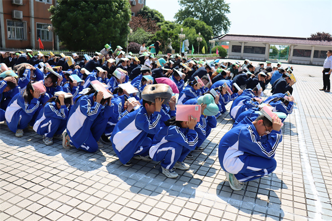 下午两点半,总指挥校长左益斌通过广播宣布“张店中学防震疏散逃生演练暨消防演练现在开始”,接着三声急促的警报声响起,正在上课的教师迅速反应,立即指挥学生用书包、书等护头,就近躲避在桌子下面或墙角,双手抓紧课桌的腿,以免课桌震动将课桌震倒。2分钟后,一长声警报声响起,学生们在教师的组织下按照指定路线沿楼道两侧行进,双手抱头迅速有序向操场撤离。到达广场后,各班立即清点人数向演练总指挥报告情况。整个演练过程紧张有序,有条不紊。防震疏散逃生演练完毕后,分管安全的副校长毛用三对本次演练活动作了总结。
