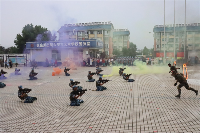 持枪行进,跪姿射击。敏捷流畅的翻转跳跃,战术表演使人身临其境,仿佛置身于烽火硝烟的战场。这一刻,似战争来临,保家卫国。这一刻眼神坚定,无所畏惧。
