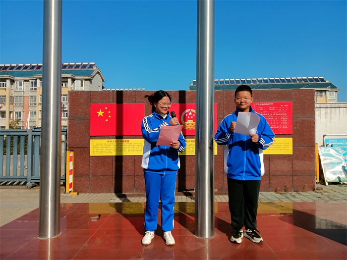 伴随着清脆的铃声,师生齐聚红旗广场。主持人首先宣布升旗仪式庄严开始,在嘹亮的国歌声中,全体师生向国旗敬礼,五星红旗冉冉升起。
