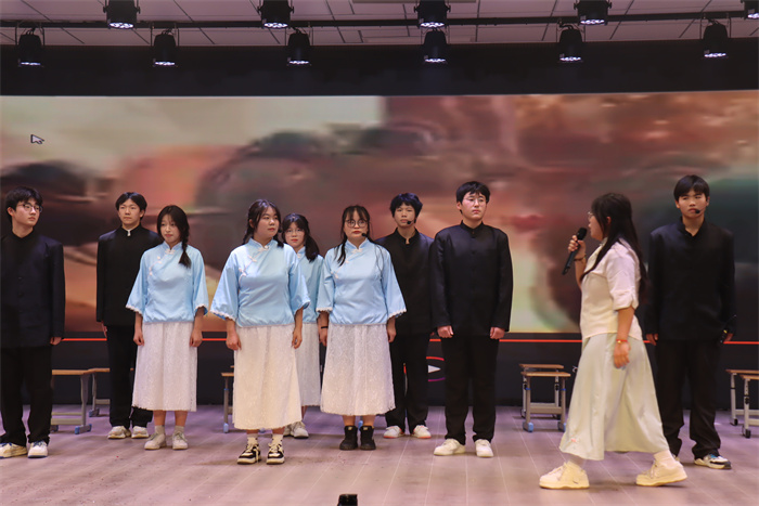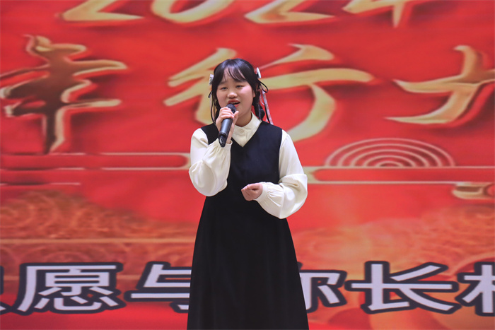 联欢会进入第三篇章“红心向党”,情景剧《满江红》荡气回肠、动人心魄,感人肺腑。民族英雄岳飞将军一曲《满江红》诠释了爱国主义的真谛。展读这篇气吞山河的盖世雄文,一股碧血丹心的报国气息迎面而来,笔笔有情,字字生辉。李仁伟同学的中华武术表演《中华武术》, 虎虎生威,中华武术名扬海外,中华儿女,笑傲天下,好男儿龙行天下,一展身手。快板《学习新思想 ,争做新青年》展现出新时代年青人无惧风雨,不畏挑战的责任与担当,他们以梦想为岸、以团结为帆、以奋斗为桨,共赴美好的未来。音乐班带来的歌曲《敕勒歌》,一下子把我们带到了辽阔的大草原,白云般的羊群,空旷的苍穹,令人震撼。大合唱《相亲相爱》深情款款,感染全场。他们的歌声告诉我们要用尊重和理解去倾听别人的声音,用关怀和支持去帮助他人,用爱去宽容别人,化解纷争,愿天下相亲相爱,愿世界永远太平。联欢会在师生合唱《领航》中画上圆满的句号。乘风破浪,扬帆起航,领航中国,在新时代的征程上像一条巨龙引领未来。