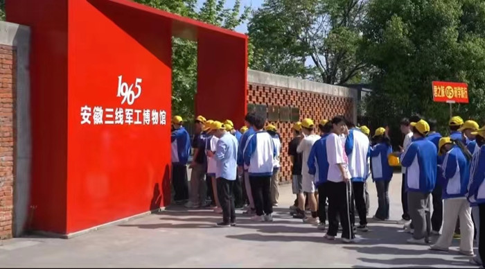 第二天,同学们首先来到安徽三线军工博物馆。安徽三线军工博物馆座落于诸佛庵镇仙人冲境内,是依托原皖西老三线军工企业建立的全国唯一 一家三线文化主题博物馆。军工博物馆是仙人冲画家村中具有军工背景的文化符号,场馆设计在保留旧址的基础上,以不同风格的展区,全景式的展示原三线军工厂生产、科研等经典场景。同学们在这里亲身感受老一代军工人热火朝天的生产场面和吃苦耐劳的革命奉献精神。