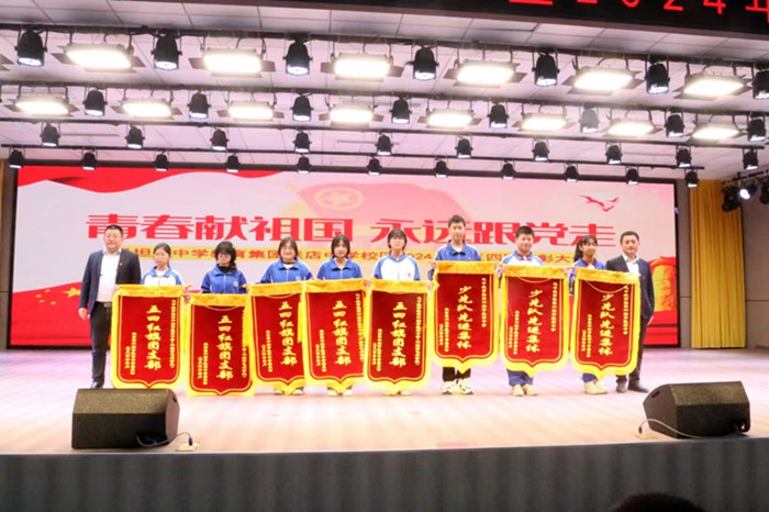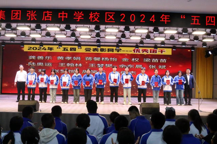 副校长肖光明宣读了《六安市张店中学关于2024年“五四”评优表彰的决定》,在热烈的掌声中,与会领导分别为2023—2024学年张店中学3个少先队先进集体、5个五四红旗团支部、23名优秀共青团干部、23名优秀共青团员、24名优秀积极分子、23名文明礼仪标兵、24名校园小雷锋代表颁奖。校领导与受表彰的集体和个人进行了合影留念。