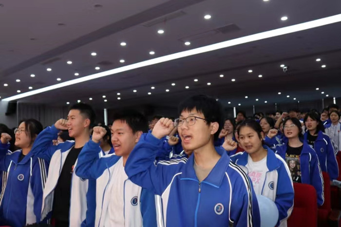 大会开始全体到会人员齐唱国歌,在雄壮的国歌声中,大会拉开序幕。首先,校党支部书记、校长左益斌在会上做了动员报告。他首先表达了对高三老师的感谢和对全体高三学子的祝福,希望高三的所有老师在最后的时间里,用真心真情陪伴高三学子,帮助他们实现自己的人生理想;希望高三学子做到心平气和,心如止水,充满自信,战胜自己。他希望同学们要充满激情走进校园,用微笑面对同学和家人,用坦然的心态面对高考。他勉励同学们,现在需要的是拿出勇气,拼尽全力向前冲,我们的目标一定会实现,我们的目标一定要实现。他预祝各位同学在高考中实现自己的梦想。
