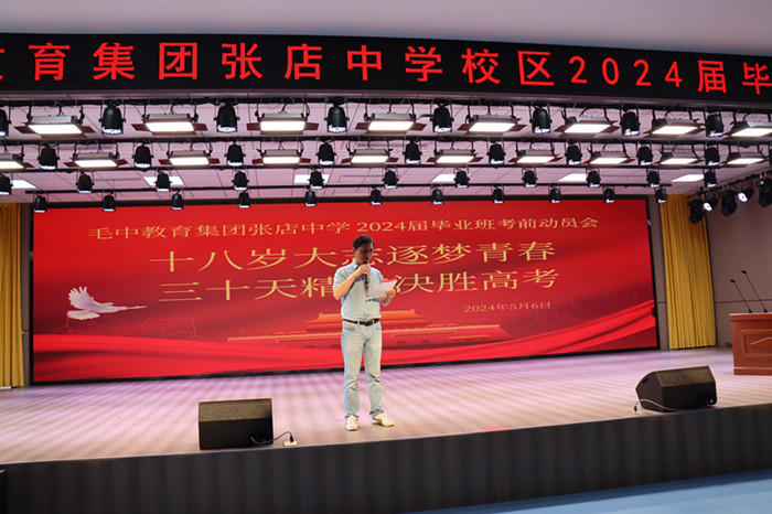 为进一步鼓舞士气,释放学生考前压力,给学生以生涯规划指导,5月6日下午,毛坦厂中学教育集团张店中学校区在校报告厅举行了以“十八岁大志筑梦青春 , 三十天精耕决胜高考”为主题的高考动员大会,校领导、毕业班班主任以及2024届高三全体师生参加了这次动员会。动员大会由教导主任阮成权主持。