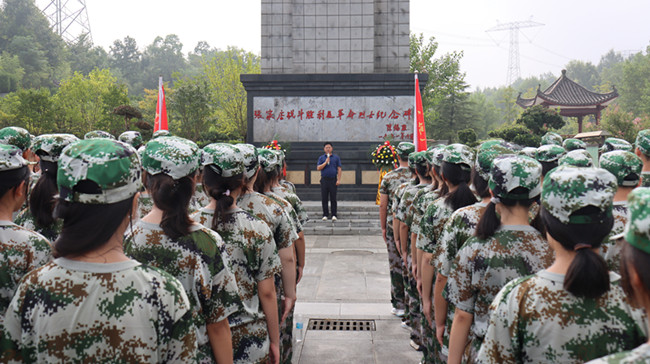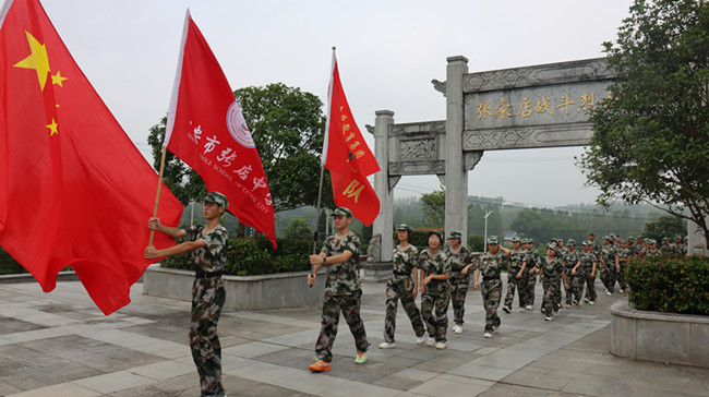 同学们在教官的指挥下,唱起嘹亮军歌,时而急行,时而缓步,浩浩荡荡向前进发。每个连队的护旗手高擎红旗,走在各自队伍的前面,各连教官和班主任在队伍旁指挥,不时提醒同学们们注意安全。校医则携带药品跟随着拉练队伍后面,做到及时处理途中出现的伤病情况。同学们步伐整齐,秩序井然,旗手们高举各班军训旗帜,边行进边唱军歌、喊口号,行进过程中嘹亮高亢的军歌声从未间断。军训团成员飒爽的英姿,整肃的军容,良好的精神状态吸引了沿途民众,他们纷纷驻足观看,有的民众还拿出手机,拍摄下这一壮观的景象。队伍中迎风招展的旗帜也成为了一道亮丽的风景线。经过近一个小时的跋涉,同学们顺利到达张家店战役烈士陵园。在那里举行了隆重的纪念仪式,仪式由校团委书记杨孝荣主持。学生代表向革命烈士们进献了花篮,校党支部书记、校长左益斌、副校长肖光明整理了花篮绶带。政教处主任邬宗江向同学们讲述了张家店战役的经过,新生代表在烈士墓前朗诵诗歌《站在烈士墓前》,并带领同学们宣誓,同学们握紧了右拳进行了集中宣誓:“历史将革命的接力棒传给了我们,今天,我们以革命事业接班人的名义承诺。”铿锵有力的宣誓声响彻云霄。新生代表还在烈士墓前进行了献诗活动。最后,左益斌校长作了总结讲话,他说:青山埋忠骨,史册载功勋。革命先烈,浩气长存,永垂不朽!同学们,你们风华正茂,是时代的幸运儿,应珍惜来之不易的幸福生活,健康成长,奋斗成才。让我们继承先烈的遗志,为家乡的建设,为祖国的繁荣昌盛而努力学习,共创美好的明天。同学们最后瞻仰了张家店战役纪念碑。