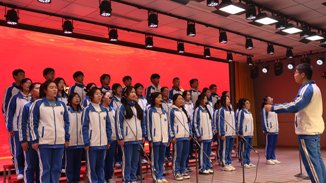 接着,比赛正式开始。七年级的《少年的你》拉开了大合唱帷幕。同学们一个个精神饱满,意气风发。每个班级都各有特色,亮点不断:有的独唱,有的伴舞,有的加入乐器伴奏,有的边歌边舞,有的深情朗诵。从豪壮的《强军战歌》、《英雄赞歌》到爱国经典《我和我的祖国》、《我的中国心》,从深情的《紫金花盛开》、《万疆》到流行金曲《星辰大海》,节目精彩纷呈。《歌唱祖国》、《唱支山歌给党听》、《没有共产党就没有新中国》、《团结就是力量》等红色经典歌曲的演唱,表达了对祖国的祝福、对生活的热爱、对劳动的赞美,对实现中华民族伟大复兴的中国梦的坚定信念。伴随着欢快的音符,洋溢着青春活力的歌声响彻整个报告厅。他们用歌声诠释着对生活的热爱,对生命的激情,对明天的期待。台下的观众完全陶醉在美妙歌声之中,每一首歌曲结束之后,都不禁响起赞美的掌声。 最后高二(9)的合唱《我和我的祖国》气势恢宏,感情充沛,表现对伟大祖国的无限深情。大合唱在美妙的歌声中落下帷幕。