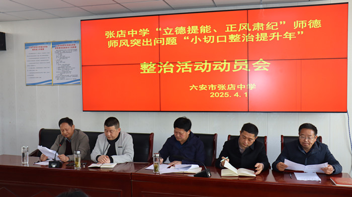 为贯彻落实区教育局师德师风建设相关文件精神,弘扬高尚师德,树立优良师风,提高师德水平,4月1日上午,毛坦厂中学教育集团张店中学校区在校会议室召开了张店中学“立德提能、正风肃纪”师德师风突出问题 “小切口整治提升年”整治活动动员会议。会议由校党支部副书记毛用三主持。