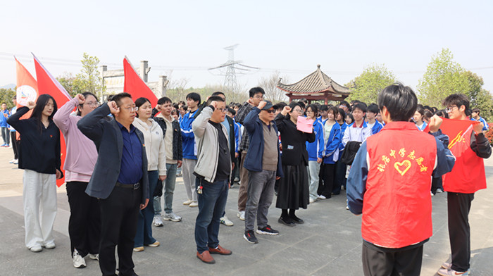 首先,学生代表在庄严的国歌声中向烈士们敬献了花篮,向革命烈士致以崇高的敬意和深切悼念。校党支部副书记毛用三、副校长杨辉分别走向烈士纪念碑前整理了花篮绶带。接着,全体师生在烈士纪念碑前默哀3分钟。然后党员代表在党旗下庄严宣誓,重温入党誓词。学生代表陈禹齐、鲍敏君上台发言:作为新世纪的青年,我们应该十分珍惜现在的生活,加倍努力,强身健体,明辨是非、区别善恶、分清美丑,树立起正确的社会主义荣辱观,为成为合格的新时代的接班人做好准备。然后黄杰、梁静怡带领同学们在纪念碑前庄严宣誓:铭记历史,缅怀先烈;继承遗志,奋发图强。热爱祖国,忠于人民;勤奋学习,追求真理。遵守纪律,团结有爱;勇于担当,报效祖国。同学们的铮铮誓言响彻云霄。