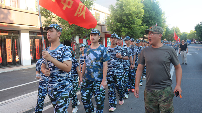 同学们在教官的指挥下,唱起嘹亮军歌,时而急行,时而缓步,浩浩荡荡向前进发。每个连队的护旗手高擎红旗,走在各自队伍的前面,各连教官和班主任在队伍旁指挥,不时提醒同学们们注意安全。校医则携带药品跟随着拉练队伍后面,做到及时处理途中出现的伤病情况。同学们步伐整齐,秩序井然,旗手们高举各班军训旗帜,边行进边唱军歌、喊口号,行进过程中嘹亮高亢的军歌声从未间断。队伍中迎风招展的旗帜成为了一道亮丽的风景线。