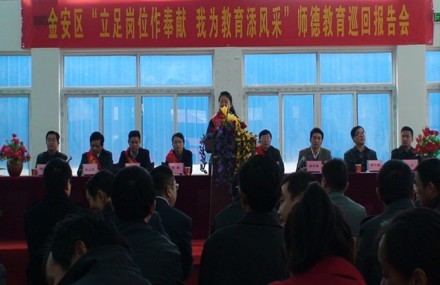 为加强师德师风建设,提升教师的师德师风水平,由教育局主办的金安区“立足岗位作奉献,我为教育添风采”师德巡回报告会于11.10上午在我校隆重举行。会议于上午9:00正式开始,报告会由教育局陆永国副局长主持,张店中学校长陈元高同志致欢迎词,接着报告团五位成员以个人的亲身经历,从不同侧面为全体与会者作了一场感人肺腑的报告。师德报告会弘扬了高尚的师德,发挥了良好的教育引领作用,引导广大教师学习身边的先进典型、争当师德楷模。我区教育系统将以此次报告会为抓手,进一步推进师德教育学习月活动。
