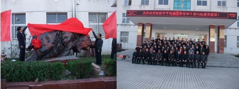 饮水不忘挖井人,成材不忘培育恩。首届学子向母校捐赠一头“拓荒石牛”作为对母校的献礼,少将姚立云为母校题字:天道酬勤,藉此以回报母校的养育之恩,也寄托他们对母校的殷切的期望,期望母校能够像“拓荒石牛“那样的开拓进取,默默奉献。聚会开始前举行了“拓荒石牛“的揭牌仪式。随后他们先后参观了学校的各个角落,充分感受了学校四十年来的快速发展和巨大变化。
