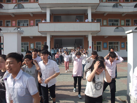 下午四点钟,总指挥陈校长通过广播宣布“张店中学防震疏散逃生演练现在开始”,接着三声急促的警报声响起,正在上课的教师迅速反应,立即指挥学生用书包、书等护头,就近躲避在桌子下面或墙角,双手抓紧课桌的腿,以免课桌震动将课桌震倒。2分钟后,一长声警报声响起,学生们在教师的组织下按照指定路线沿楼道两侧行进,双手抱头迅速有序向操场撤离。到达操场后,各班立即清点人数向演练总指挥报告情况。整个演练过程紧张有序,有条不紊。防震疏散逃生演练完毕后,分管安全的左副校长对本次演练活动作了总结。