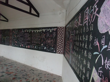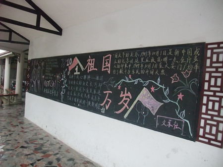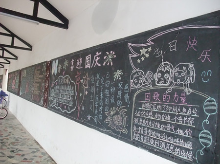 9月28日,在第67个国庆节即将到来之际,张店中学各班级在文化长廊出了一期以庆祝国庆为主题的黑板报,表达了对祖国的热爱之情。 该校各班级成立了板报小组,对版面进行了精心的设计,内容丰富多彩,画面呈现出喜庆祥和的气氛,充分显示了张中学子的合作能力和艺术水平(邓启胜)