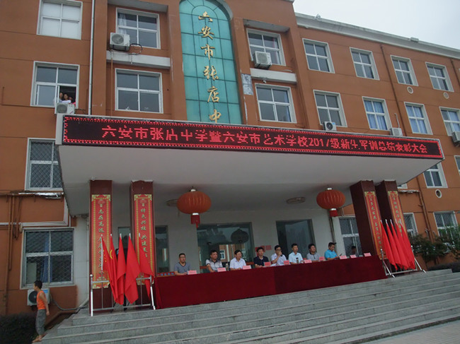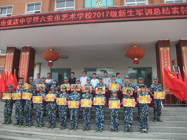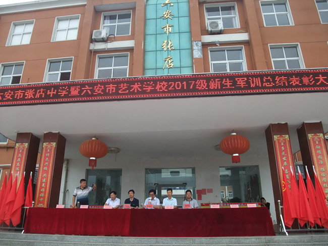 8月29日上午,张店中学暨六安市艺术学校2017级新生军训汇报表演暨总结表彰大会在该校红旗广场举行。张店中学行政领导、军之旅承训单位领导李千勇、军训各班主任及承训的官兵参加。