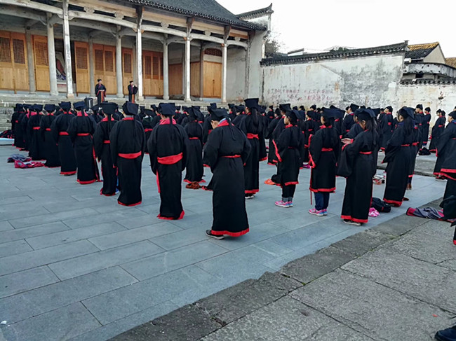 第一站来到程坎进行了民俗体验。呈坎是中国迄今保存最古老的八卦村。被誉为:中国风水第一村。龙溪河由北向南宛如一条腾飞的巨龙穿村而过。自古以来呈坎是一个进得去,便出不来的神秘之地。民间俗语:登灵山佛佑天下,游呈坎一生无坎。同学们体验民俗以后还进行了拜师礼,学习传统文化。