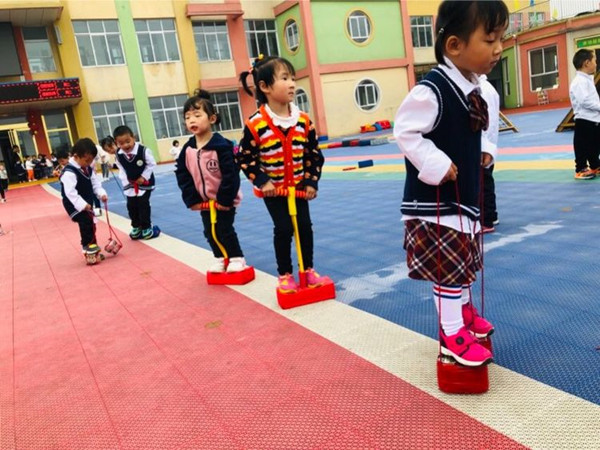 接着,观看的是户外游戏。“传统游戏”是由穿大鞋、踩高跷以及青蛙跳组成,大鞋和高跷都是该园自制的玩具,用竹子做成,这一游戏能锻炼孩子的平衡能力以及手眼协调的灵活性。