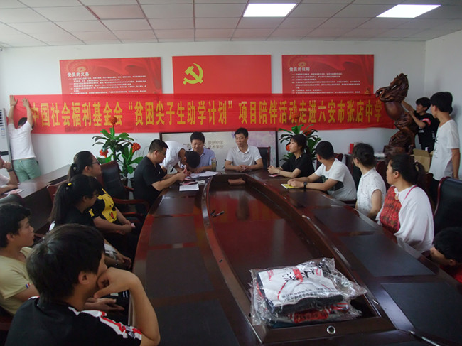 7月5日上午,六安市张店中学举行中国福利基金会“贫困尖子生助学计划”项目资金发放仪式。副校长严帮军、左益斌、校团委书记毛用三、工会邓主席等参加了仪式。