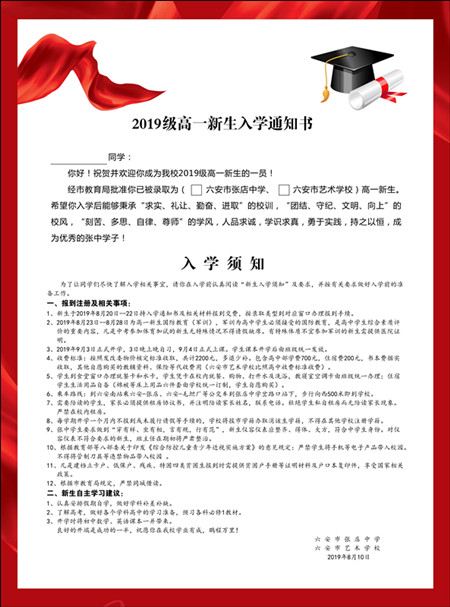 张店中学暨六安市艺术学校2019年新生入学须知