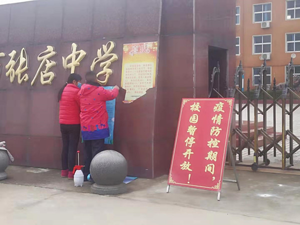 封闭校园。27日,副校长严帮军在区教育局召开防控新馆肺炎疫情工作布置会回来以后,立即布置校警封闭校园,严禁任何外来人员出入校园,并树立“疫情防控期间,校园暂停开放”的警示牌,并布置校警、值班人员,严格值守工作岗位,记录并上报当天疫情。制定了《张店中学关于防控“新冠肺”期间校园管理的暂行规定》进行张贴。