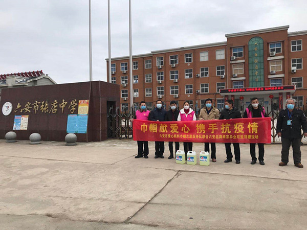 2月8日下午,爱心妈妈巾帼志愿服务队队长、民进六安会员王芳、市公安局机关纪检书记纵浩一行,携带30公斤消毒液送到张店中学,用来援助该校防控新冠病毒感染的肺炎疫情。