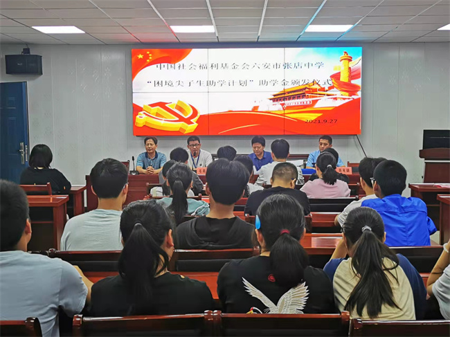 9月28日,张店中学举行中国福利基金会“贫困尖子生助学计划”项目资金发放仪式。校长左益斌、副校长毛用三、肖光明,工会主席邓启胜、教师代表等参加了仪式。校团支部书记杨孝荣主持仪式。